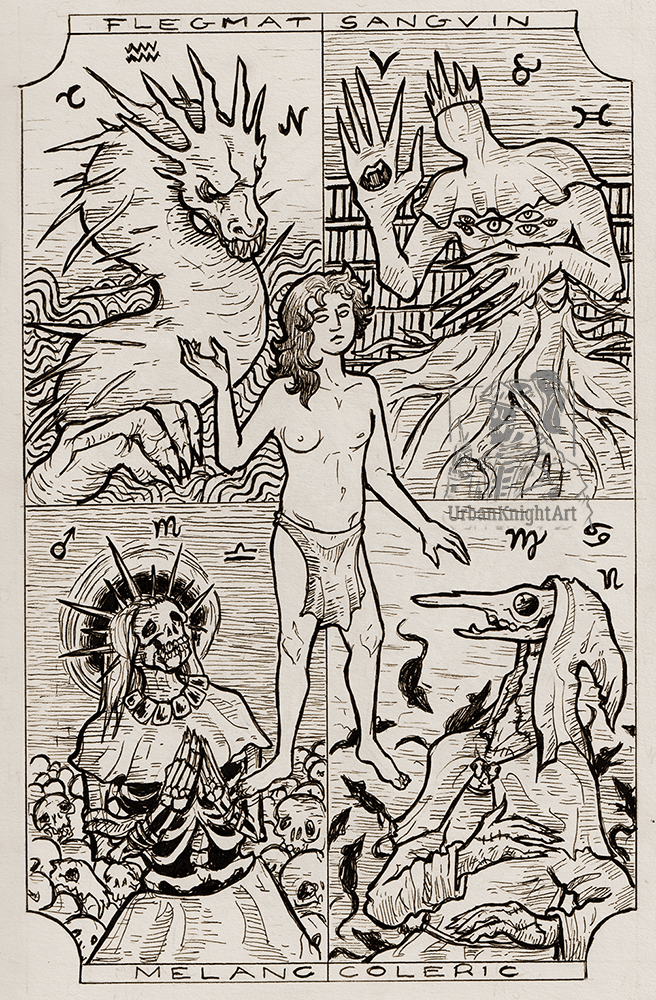 “As the Great One left, it was but the four lesser gods that remained, in charge of the rest of humanity and their humours. The cold and distant Serpent ruling over phlegm, the knowledge hungry Librarian in charge of blood, the reclusive Bishop with the black bile enclosed within, and last but not least, the bitter Piper who deems deserved better than his kingdom of yellow bile.”