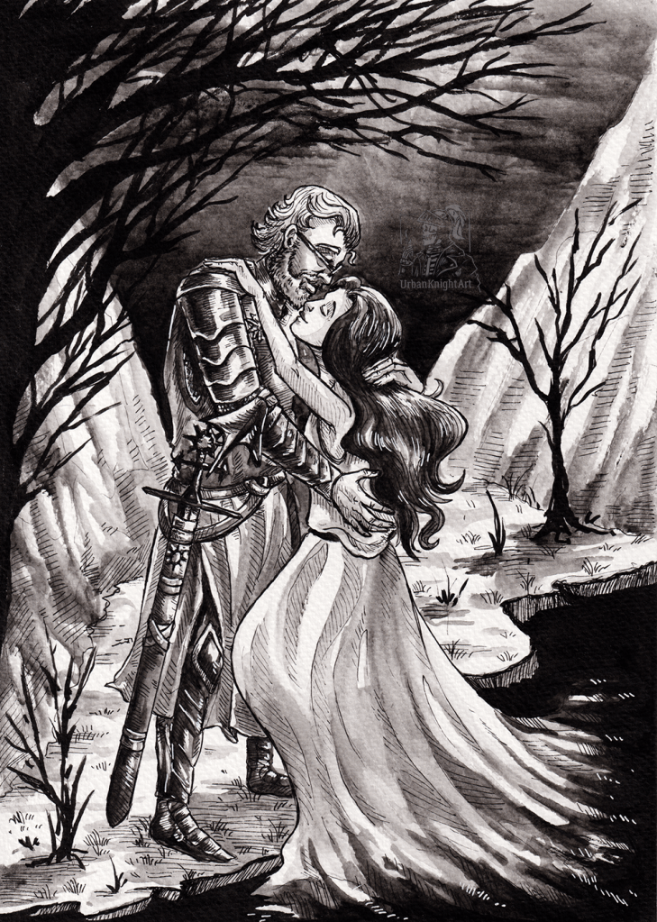 Commission for a lovely friend of her and her husband’s characters, based on an illustration of Tristan and Isolde, with Godwynn pulling his lover out of the River Styx.